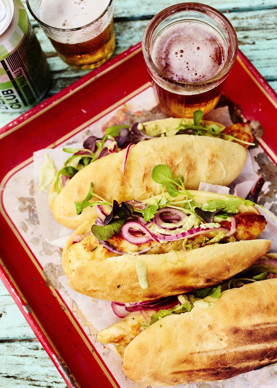 Haukikebakko korvaa nakin tässä uudenlaisessa hot dogissa! Lisää täytteiksi hernedippiä, marinoitua sipulia ja salaattia.