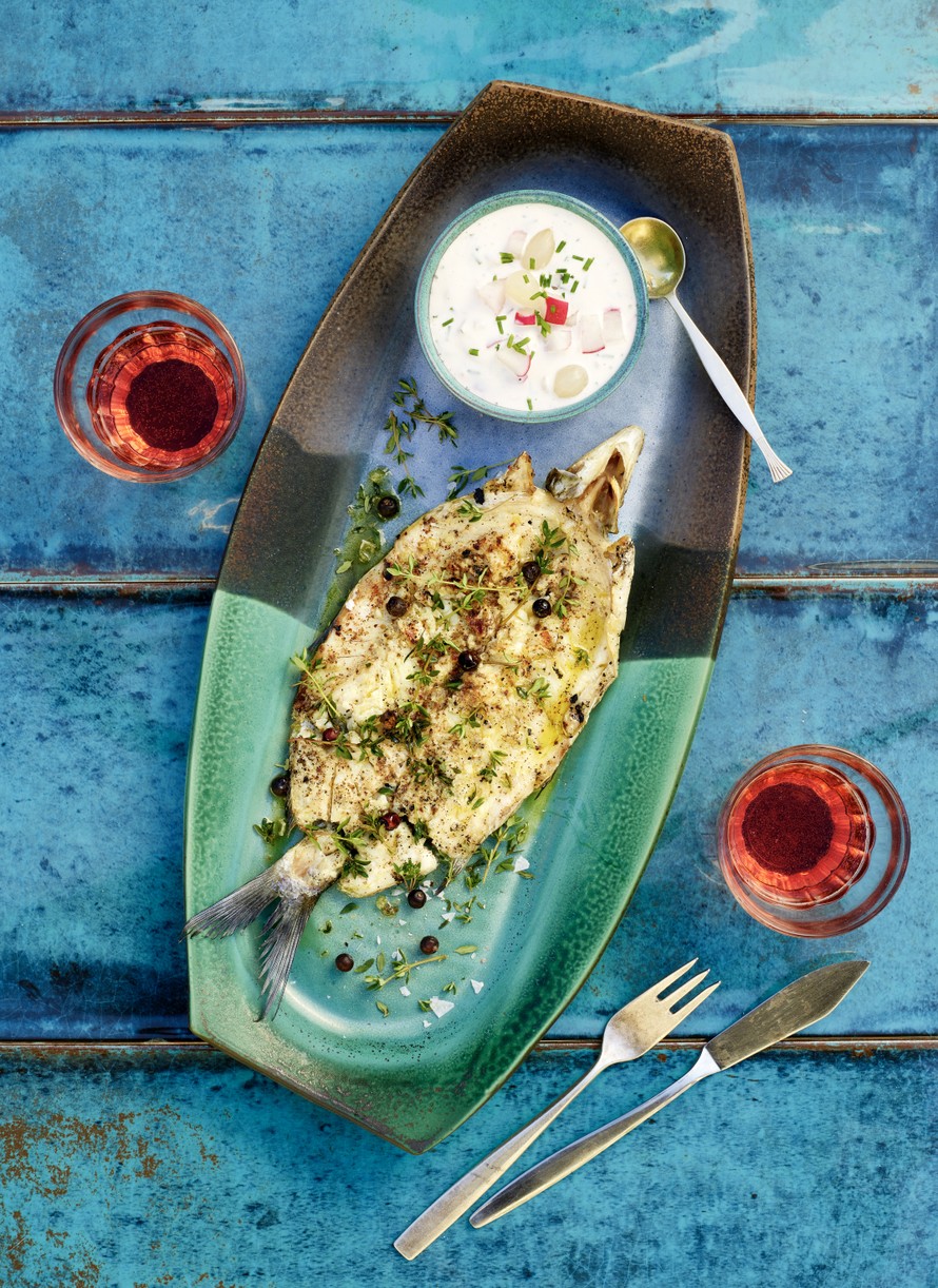 Siirrä kala ison lastan avulla tarjoiluastiaan ja kaada oliiviöljyä pinnalle. Tarjoa retiisiremouladen kanssa.