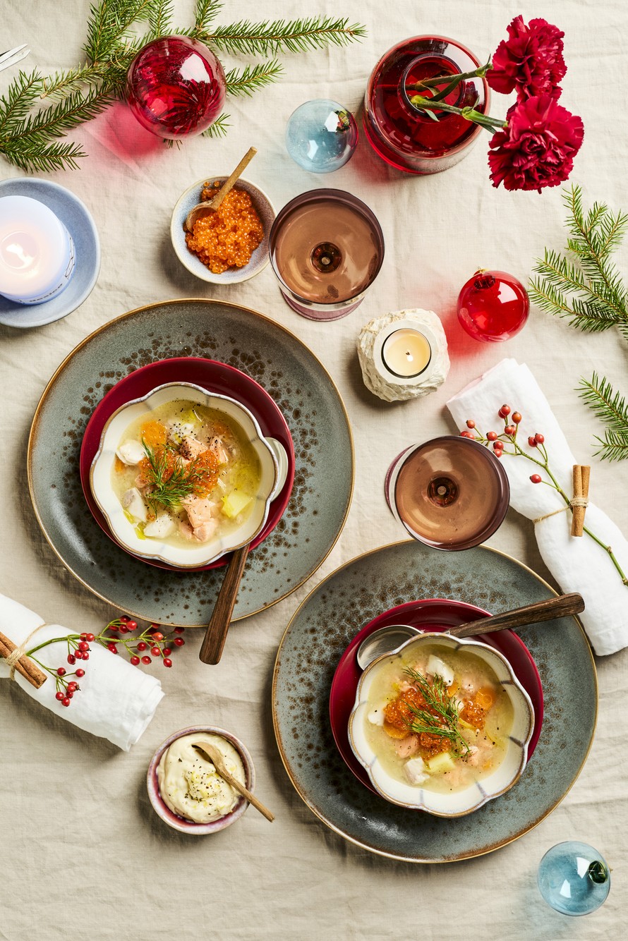 Juhlavassa keitossa on kahta eri kalaa, maukas liemi ja nokare mätiä. Sitruunamajoneesi maustaa kirkasliemisen keiton vielä herkullisemmaksi.