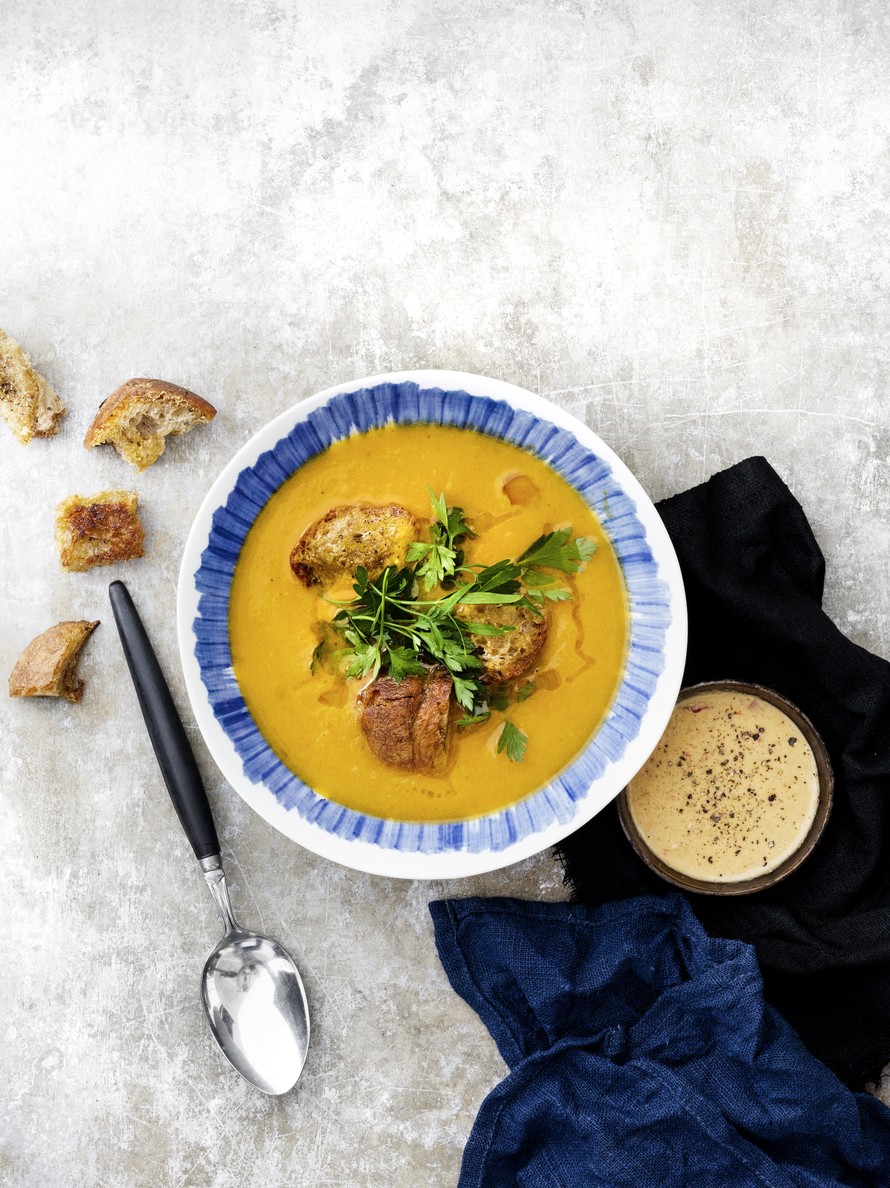 - Soseuta keitto sauvasekoittimella. Mausta ja lisää suolaa maun mukaan. Hauduta keittoa noin 15 minuuttia. Silppua päälle lehtipersiljaa. Tarjoa rouillen ja paahdettujen leipäkuutioiden kanssa.