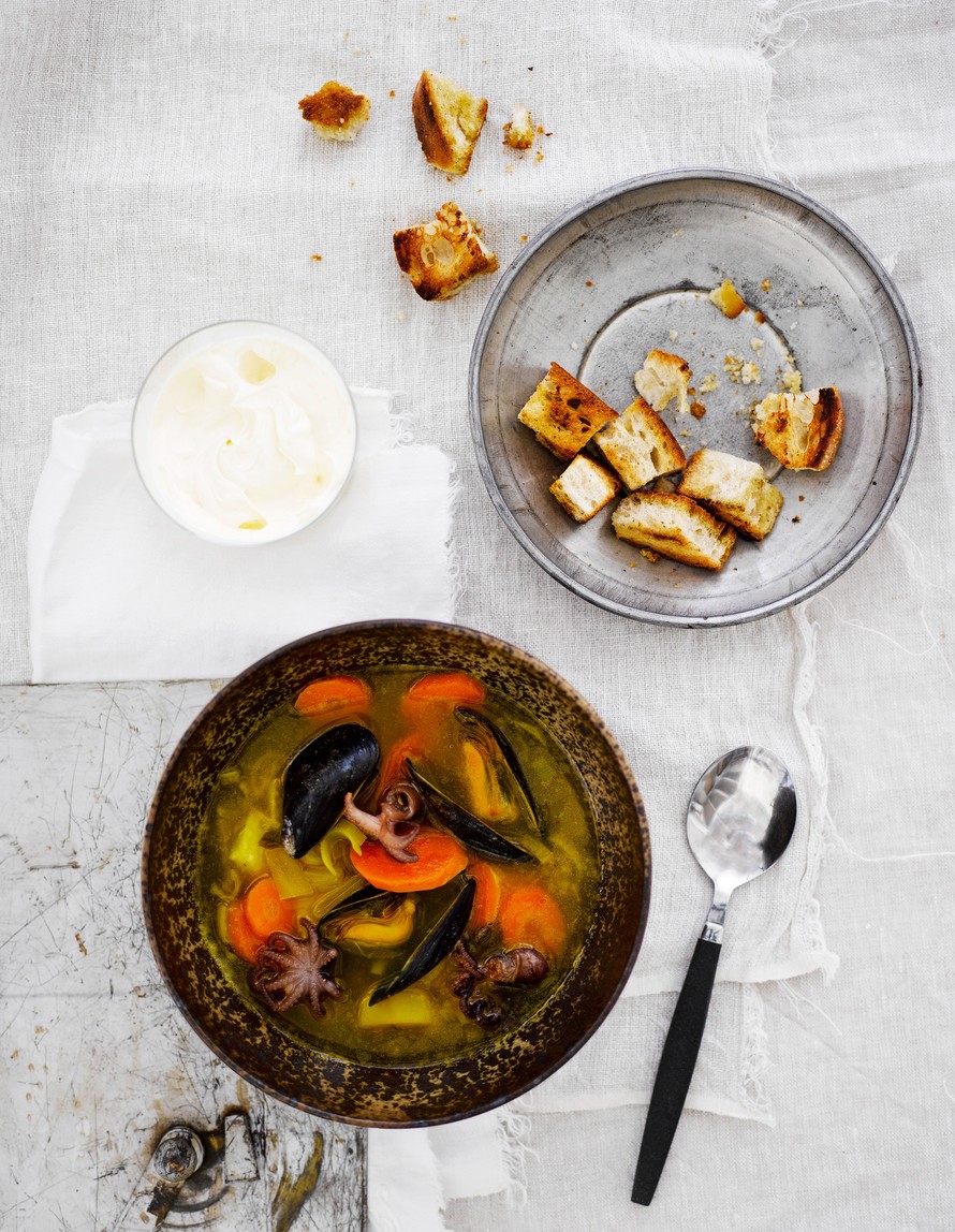 Mausteinen äyriäiskeitto ja cayennekrutongit