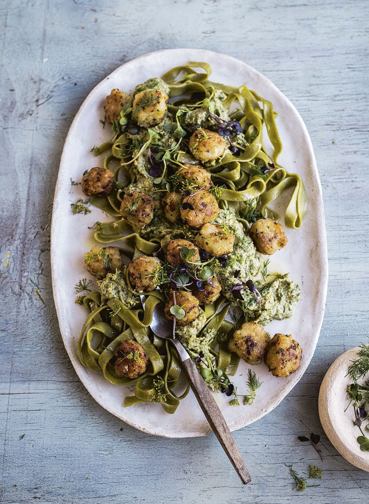 Ihanan keväinen pasta saa makunsa nokkoshummuksesta ja limetillä maustetuista kalapyöryköistä.