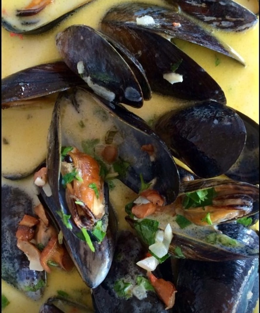 - Kaada valkoviini ja puhdistetut sinisimpukat ja sulje kasarin/vokkipannun kansi. Anna simpukoiden keittyä kunnes ne ovat auenneet n. 5 min. Heitä pois simpukat, jotka eivät auenneet, niitä ei saa syödä!
