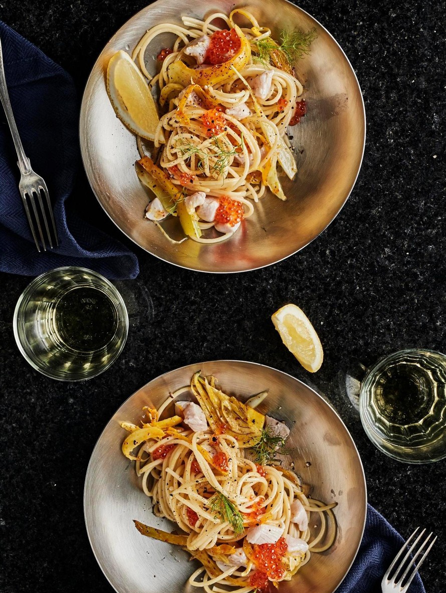 Mätipastaan sopii mainiosti kala, joka on kypsennetty paistinpannun sijaan sitruunamehulla ja suolalla. Pikapaistetut, sahramilla maustetut fenkolit antavat pastaan ihanan luksuslisän.