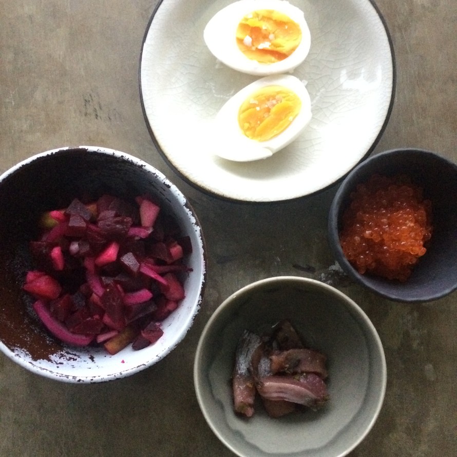 - Keitä perunat kuorineen kypsiksi suolalla maustetussa vedessä. Jäähdytä jääkaapissa seuraavaan päivään. Perunat saavat olla kylmiä, kun aloitat salaatin tekemisen. Kuori perunat ja kuutioi ne pieniksi. Kuutioi punajuuret samankokoisiksi kuutioiksi.