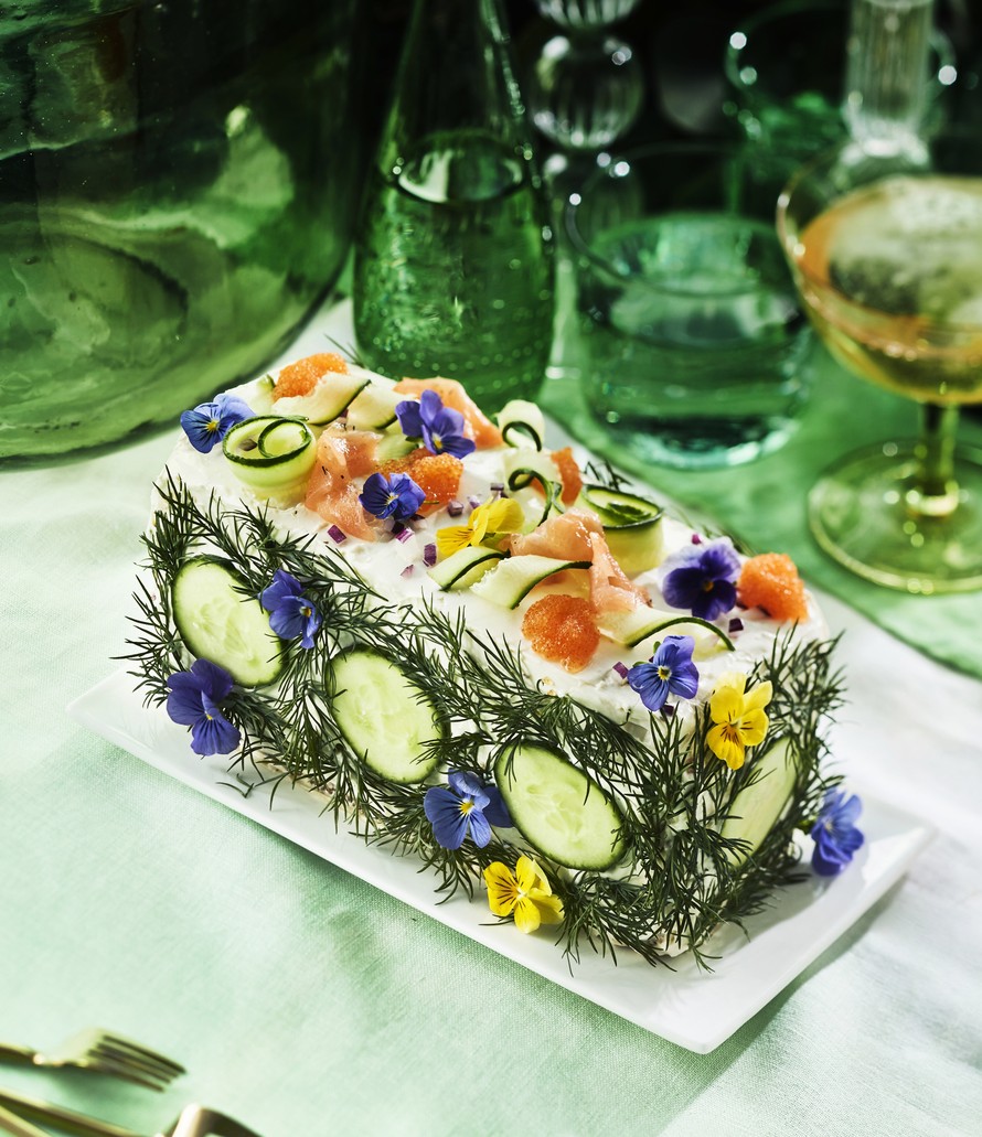 Viipaloi kurkku, hienonna punasipuli ja nypi tillin lehdet. Koristele kakku kurkuilla, sipulilla ja tillillä, lusikoi mätiä ja revi graavilohta kakun pinnalle. Koristele kakku lopuksi kukilla.