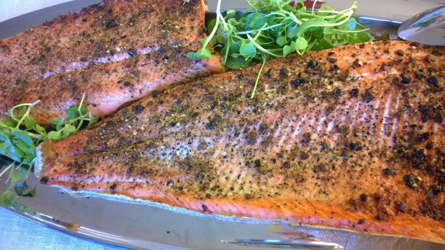 Tarjoile lämpimänä tai seuraavana päivänä kylmänä. Molemmat toimii. Tämän kalan kanssa on se hyvä puoli että jos alkupalat ja drinkit venyy niin ei haittaa - kalan pitää olla kuivaa... ; )