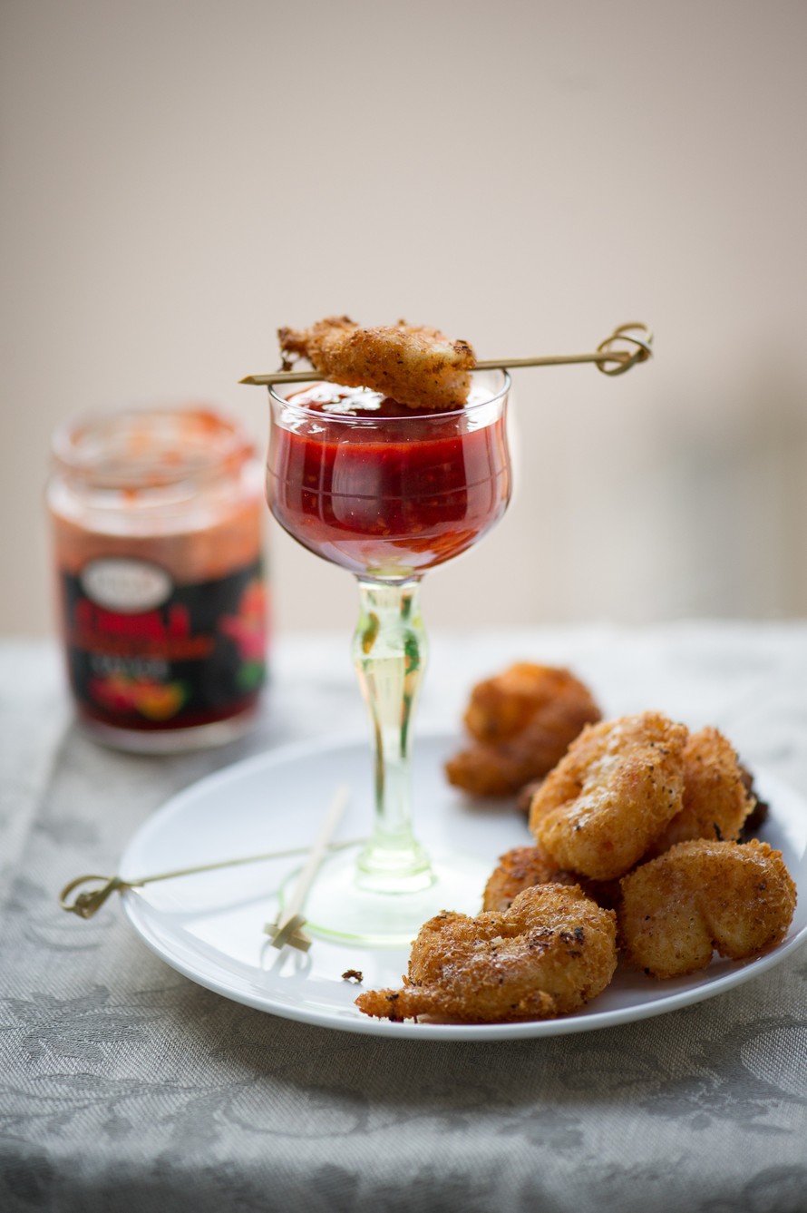 Friteeratut kookos-jättiravut Buga´s Sweet chili kastikkeella