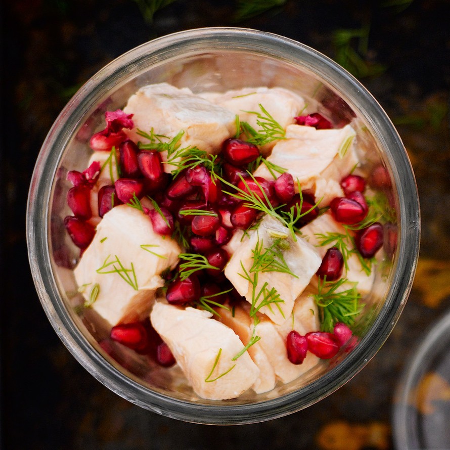 - Halkaise granaattiomena ja irrota siemenet. Hienonna tilli. Nosta lohipalat liemestä tarjoiluastiaan ja lisää siemenet ja tilli. Ripottele sormisuolaa päälle. Halutessasi lisää hieman raastettua sitruunankuorta.