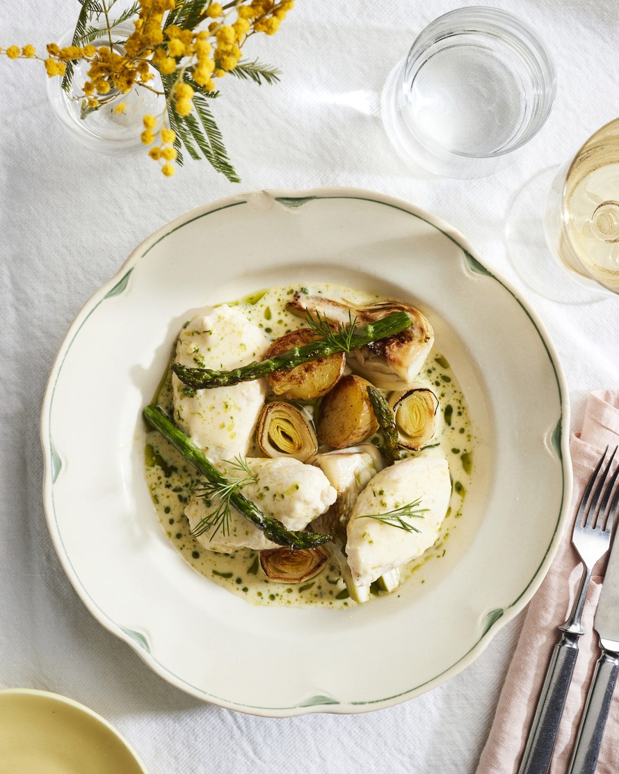 Tee kastike. Hienonna salottisipuli. Sulata pienessä kastikekasarissa ruokalusikallinen voita ja kuullota sipulia siinä keskilämmöllä pari minuuttia tai kunnes sipulit muuttuvat läpikuultavaksi. Lisää valkoviini, valkoviinietikka ja kalaliemi. Keitä lientä kasaan noin 10 minuuttia tai kunnes lientä on jäljellä noin puolet.
