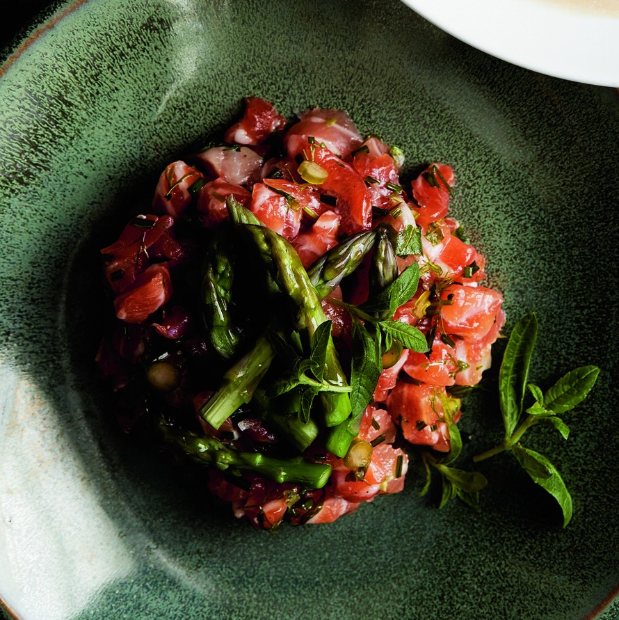 Muotoile lohiseos tartarpihveiksi lautasille. Rouhi valkopippuria pintaan. Koristele parsannupuilla ja sitruunaverbenalla tai -melissalla.
