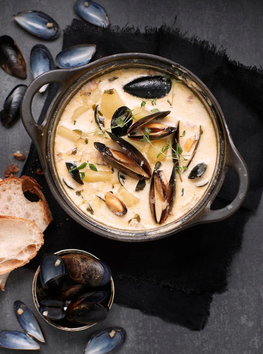 Lisää viini, anna sihahtaa ja keitä hieman kasaan. Lisää kanaliemi, kerma ja misotahna ja keitä noin 20 minuuttia, kunnes perunat ovat kypsiä. Nosta lämpöä ja lisää simpukat pakkauksen ohjeen mukaan vielä (3–5 minuutiksi), kunnes ne aukeavat. Heitä aukeamattomat pois.