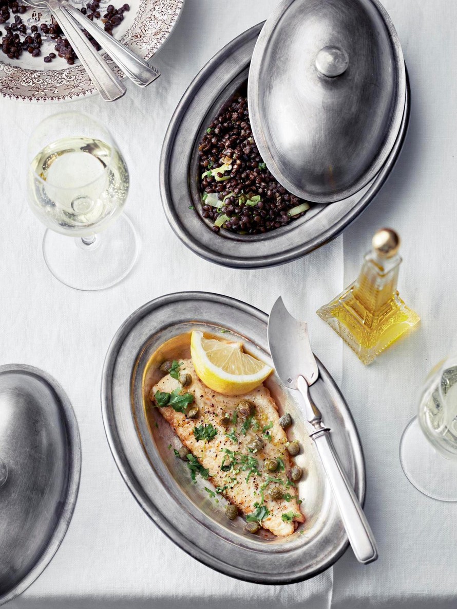 Kala on valmista, kun se on lohkeavan kypsää. Lisukkeena maistuvat ranskalaistyyliset purjolla maustetut linssit.