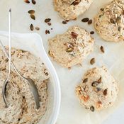 Kuori ja paloittele salottisipuli ja valkosipulinkynsi monitoimikoneen kulhoon. Kuutioi voi, ja lisää se ja pinaatti kulhoon. Revi yrtit mukaan.