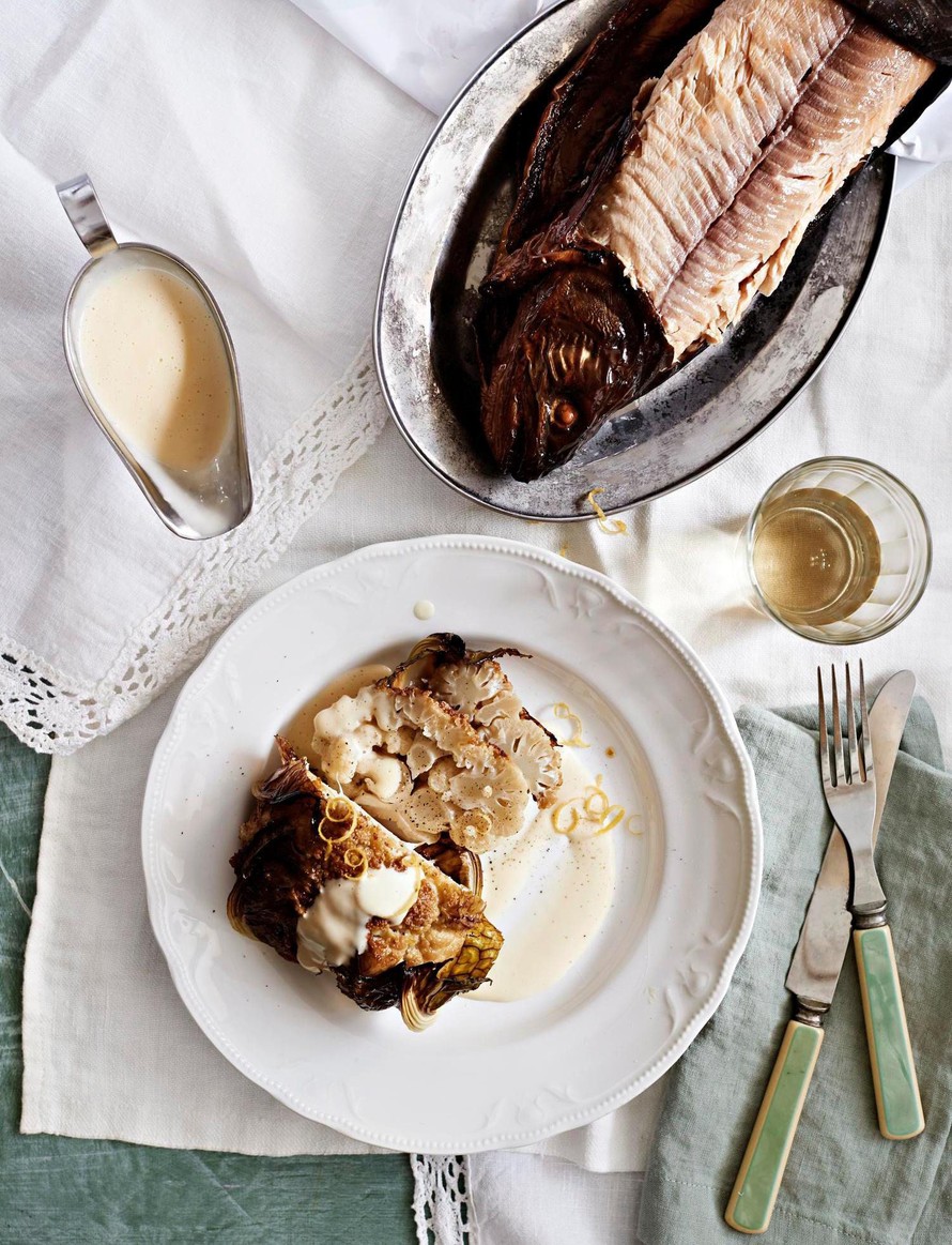 Sitruunavoilla sivellyt kukkakaalit paahtuvat napakan meheviksi uunissa. Seurana maistuu klassinen voi-valkoviinikastike. Kimpale savukalaa tekee duosta mahtavan hyvän trion.