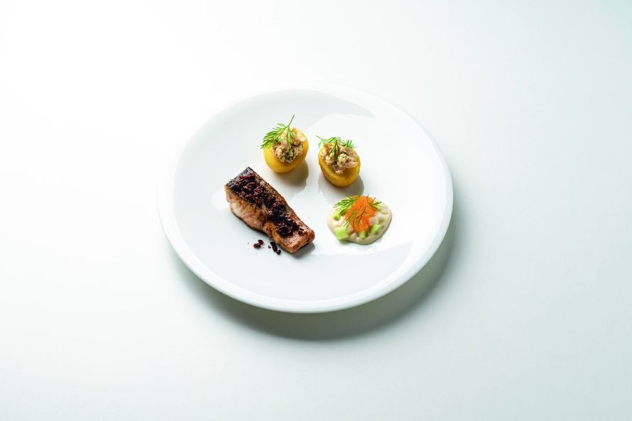 Tähtikokki Tommi Tuomisen suunnittelema annos sisältää paistettua kuhaa, rapuperunoita ja kurkku-kyssäkaalisalaattia. Kuva Santeri Stenvall, lautanen E. Ahlström.