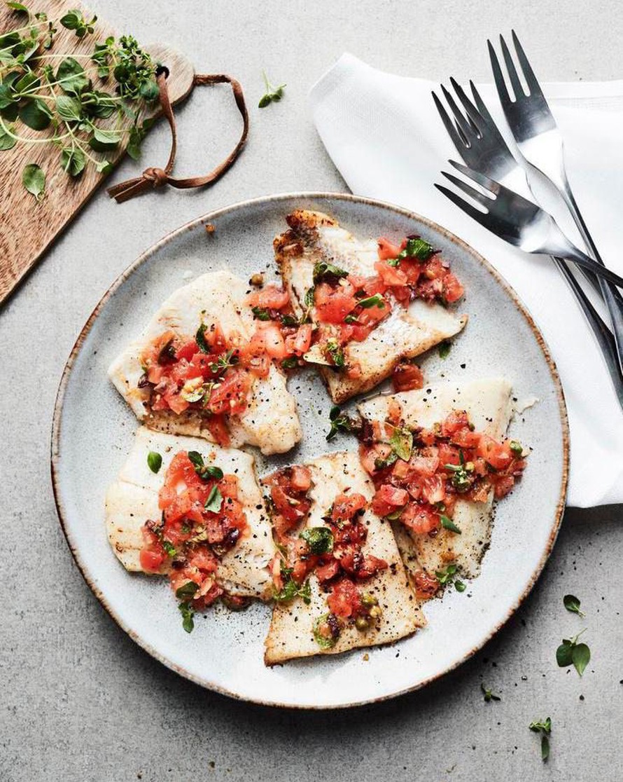 Paistettujen kalafileiden seuraan sopii kylmä ja raikas tomaattikastike, joka saa makunsa oliiveista ja kapriksista.