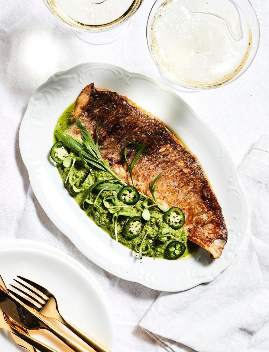 Paistetun siian kanssa maistuu vihreä romesco, joka rouhaistaan manteleista, kevyesti paistetuista kasviksista ja mausteista. Pieni pala piparjuurta antaa makuun ytyä.