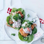 Yhdistä korppu- ja ruisjauhot laakeassa kulhossa. Nostele marinadista kaksi kalafileetä kerrallaan, valuta ne ja paina vastakkain. Pyörittele tuplafilee jauhoseoksessa. Tee samoin kaikille kaloille.