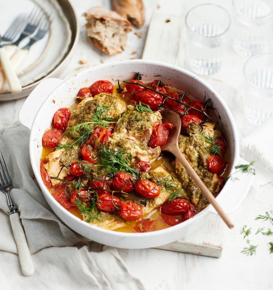 Aseta kalapalat vuokaan tomaattien päälle. Kypsennä vielä 20–25 minuuttia, kalapalojen paksuudesta riippuen.