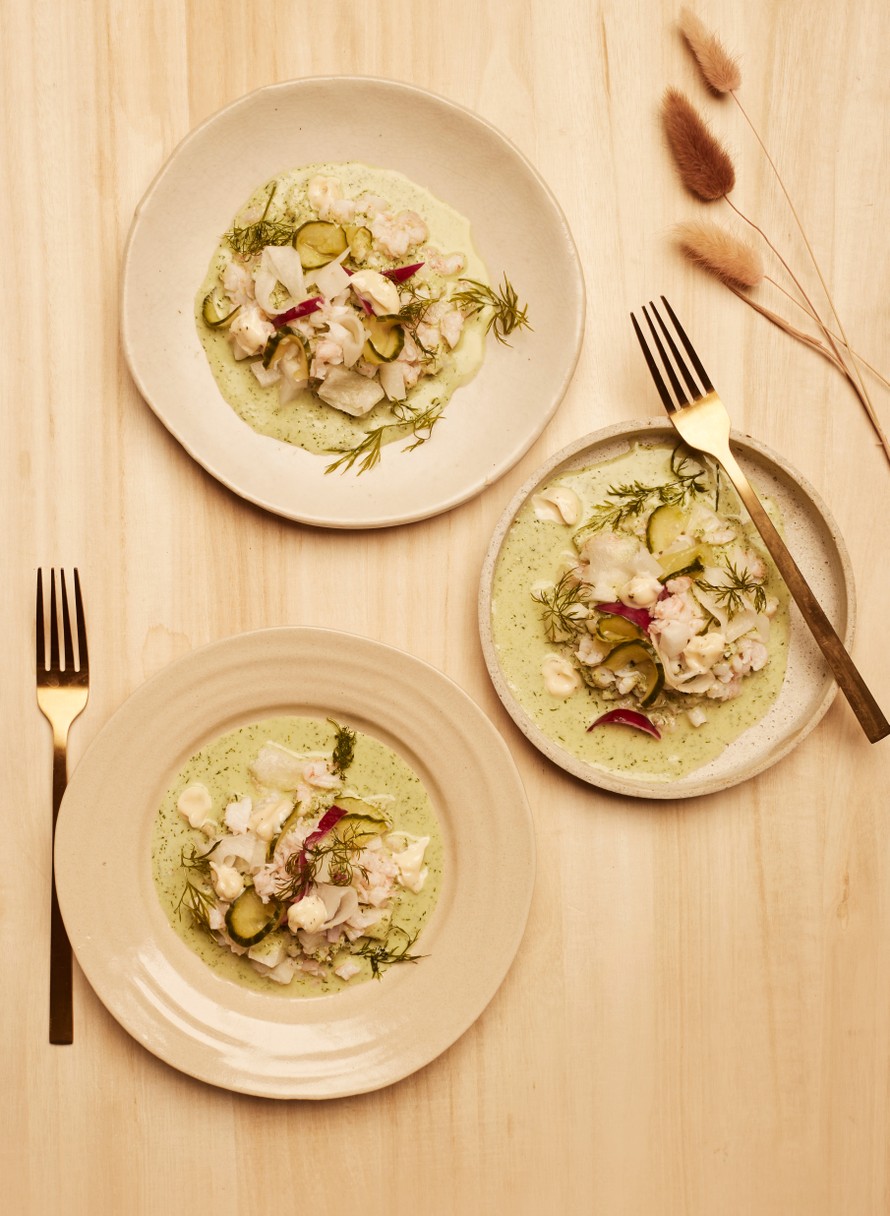 Valuta katkaravut ja kaalilastut liemistään, jaa ne annoslautasille. Kaada päälle tilliöljy-piimää ja lisää pippurimajoneesia nokareina. Koristele annokset tillillä. Voit lisätä viimeistelyksi ohuita kurkkusiivuja ja marinoitua punasipulia.