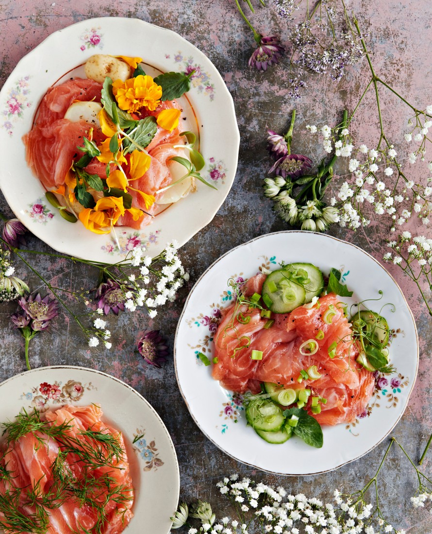 - Leikkaa kala ohuiksi, nahattomiksi viipaleiksi ja asettele tarjoiluvadille. Tarjoa keitettyjen uuden sadon perunoiden kanssa. Koristele esimerkiksi tillillä, ruohosipulilla, retiiseillä, sitruunankuorella ja/tai syötävillä kukilla.