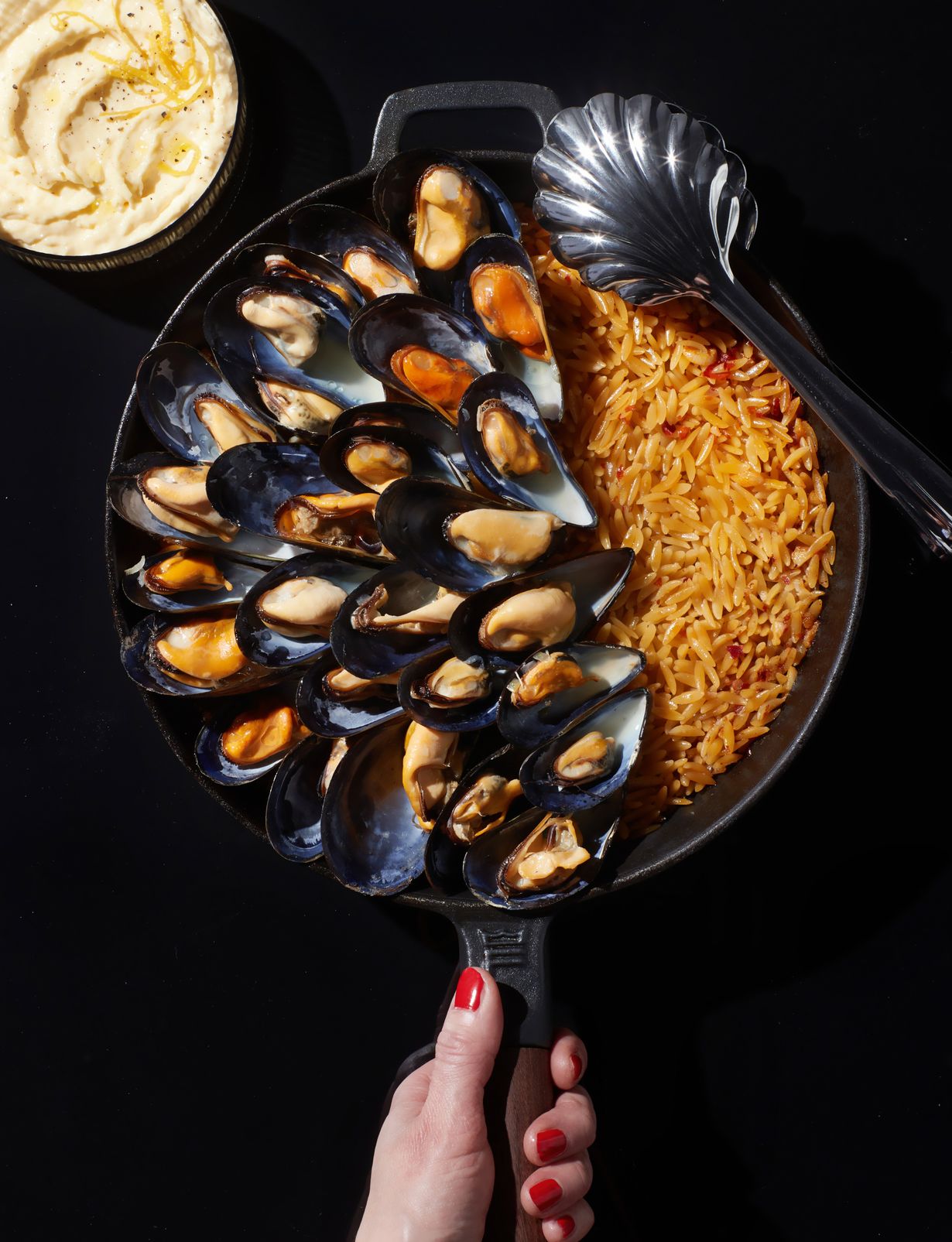 Sinisimpukat ja orzo-pasta ovat täydellinen pari. Orzo saa makunsa ja mehevyytensä simpukoiden keitinliemestä, joka imeytetään jyväpastaan kypsennyksen aikana. Parmesaanimajoneesi on piste iin päälle.