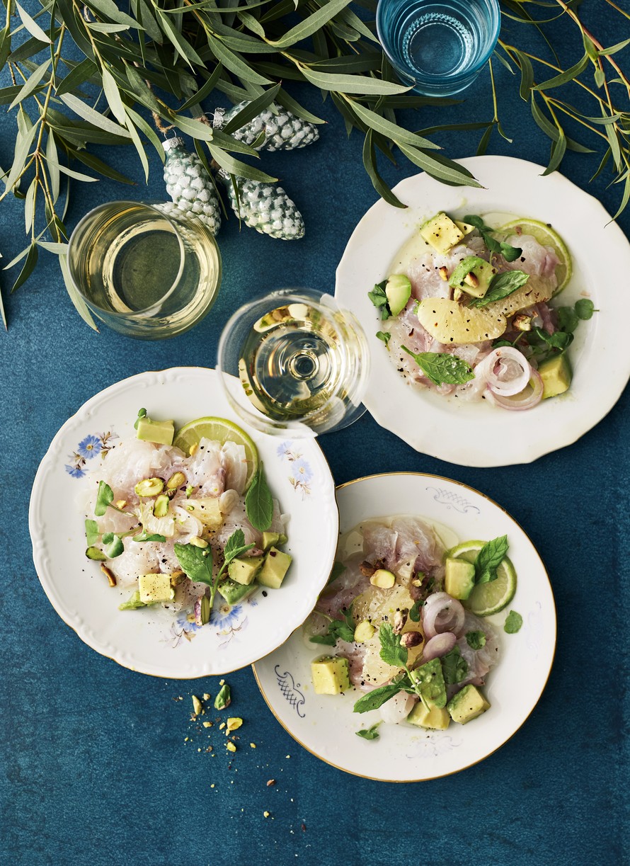 Mitä saadaan, kun yhdistetään graavisiika ja ceviche? Herkullisen raikas kala joulupöytään. Raaka kala kypsyy pikaisesti greippi- tai limettikylvyssä ja saa makuparit mintusta ja pistaasista.
