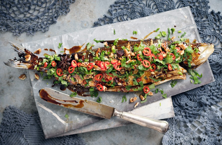 - Nosta kala tarjoiluvadille. Valuta päälle loput maustesiirapista. Ripottele pinnalle myös yrttejä, chiliä ja pekaanipähkinää.