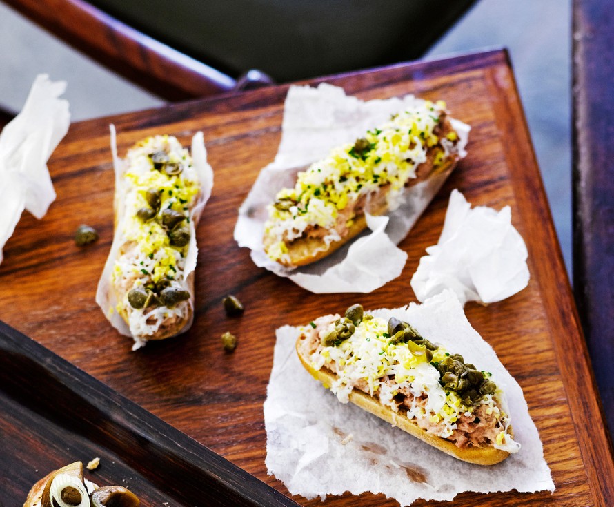 Voiko kananmunaa raastaa? Kyllä vain, saat siitä maistuvan koristeen tonnikalamajoneesilla päällystetyille patongeille.