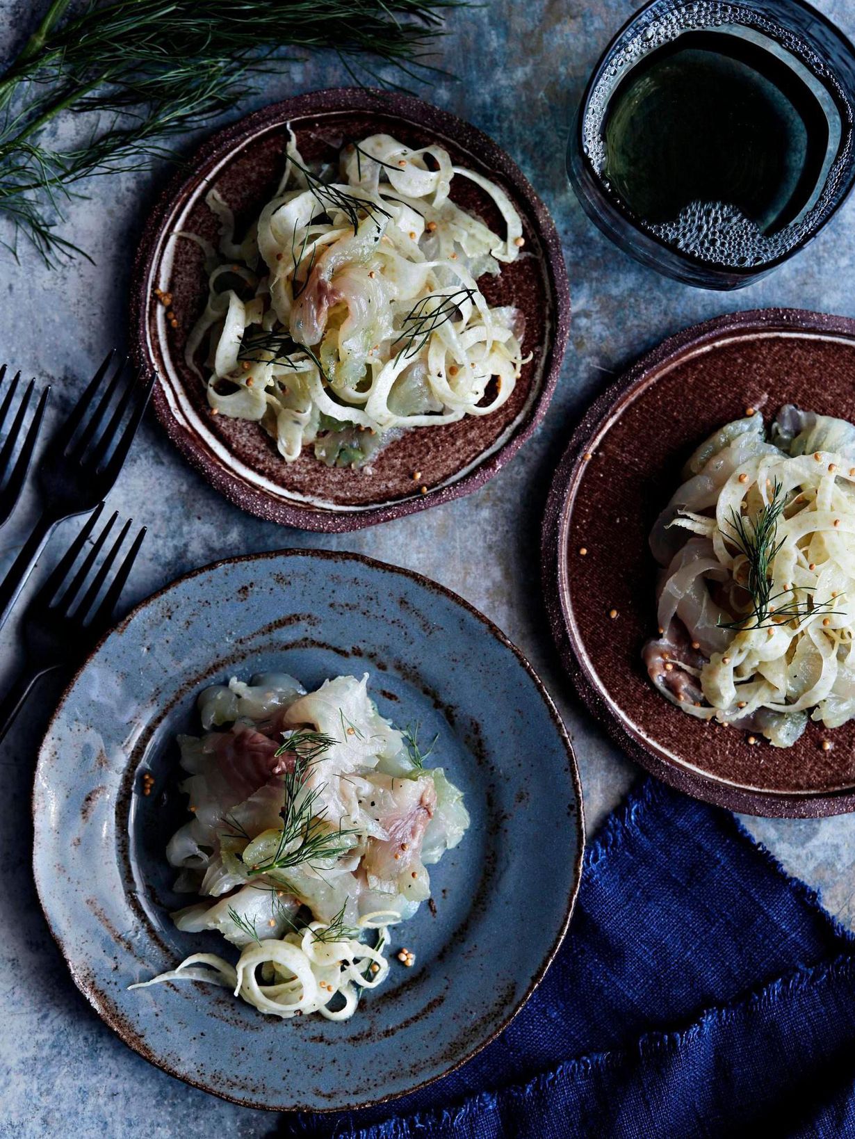 Kolmen yrtin kombo ja anisviina antavat luonnetta graavisiialle. Tarjoa alkuruokana tuoreesta fenkolista valmistetun salaatin kanssa.