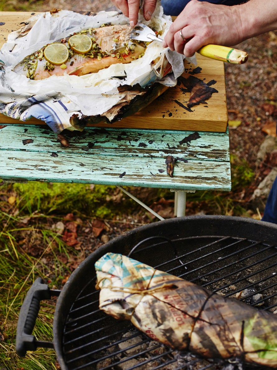 - Kääri molemmat kalat napakasti omiin voipapereihinsa ja sulje paketit rullaamalla voipaperin reunat tiukasti kiinni. Kääri kumpikin paketti tiiviisti kolminkertaiseen sanomalehtipaperiin niin, että voipapaperi on varmasti piilossa. Sido paketit huolellisesti paistinarulla. Upota paketit kylmään veteen niin, että sanomalehti kastuu läpikotaisin. Tämä estää paperin palamisen grillauksen aikana.