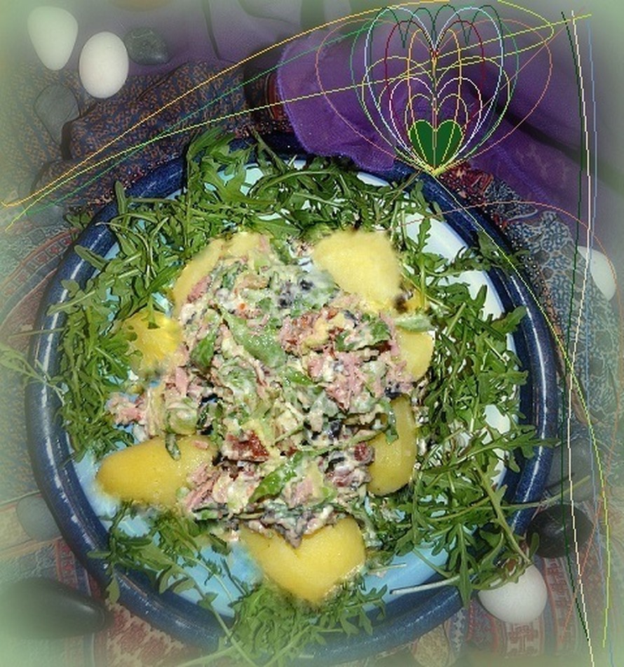 Tonnikalaa, aurinkokuivattua tomaattia, créme fraiche, vihreä oliivi, musta oliivi, limemehua, rucolaa, avocadoa, keitettyä perunoita