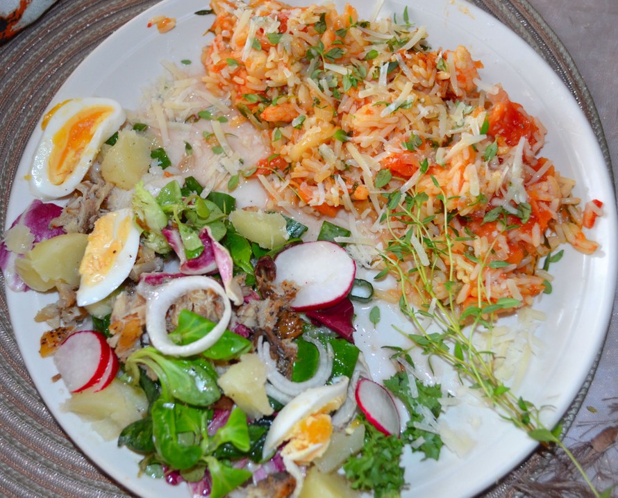 Laita salaattikulhoon provence salaattiainekset, silppua sinne kevätsipulit, pilko retiisit suikaleiksi, katso suurimmat ruodot pois pippurimakrillista ja hienonna se salaattikulhoon. Siivuta myös salottisipulit, ja ota pakkasesta katkaravut ja sulata mikrossa, sekoita niiden joukkoon paprikapestoa ja chilipestoa haluamasi määrä mutta ei liian vähän tai niukasti. Kuori täysveriappelsiini ja pilko se lohkoiksi. Laita kuoritut perunat kiehuvaan veteen kattilaan ritilän päälle n. 40 minuutiksi, 15 minuuttia keittoajan lopusta laita ritilälle kananmunat keittymään kansi koko ajan päällä. Laitettuasi perunat kattilaan, ala tehdä täysveriappelsiinirisotto; Laita oliiviöljy wok-pannuun, kuullota salottisipuleita siinä ja lisää riisi joukkoon ja sekoita kunnes riisi on lasimaista, lisää sitten viini. Anna viinin imeytyä ja lisää myös kasvisannosfondi, appelsiininpalat, sekä vettä pari desiä. Hauduta risottoa 15-20 minuuttia. Laita kannelliseen purkkiin salaatinkastikeainekset ja ravista kunnolla. Lisää timjami yrttiä 5 minuuttia ennen kuin riisi on risotossa pehmeää täysin ja anna olla keskilämmöllä. Laita kuorimasi katkaravut viimeisenä vasta pataan etteivät ne liian kuumassa käpristy pienemmiksi, ja lämmitä hyvin vähän aikaa kääntäen koko risottoa noin pari minuuttia. Laita annoslautasiin risottoa ja päälle parmesaanijuustoa ja timjamia. Paloittele keitetyt perunat ja viipaloi keitetyt kananmunat sekoittaen ne pippurimakrillisalaatin joukkoon. Lisää jokaiseen annoslautaseen salaatin päälle salaatinkastiketta.