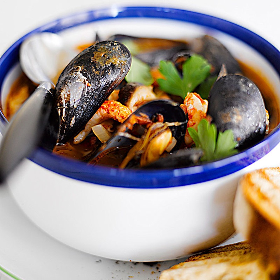 - Lisää kalat ja tuoreet simpukat. (Säilötyt simpukat lisätään samaan aikaan katkarapujen kanssa.) Kuumenna kiehuvaksi ja keitä 5 minuuttia. Lisää katkaravut ja kuumenna kunnes ne lämpenevät. Hienonna persilja pinnalle ja tarjoa leivän kanssa.