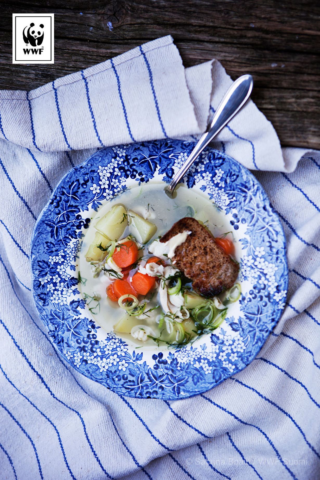 Paahdetun ruisleivän ja voin aromi viimeistelevät kansalliskalastamme valmistetun ihanan keiton.