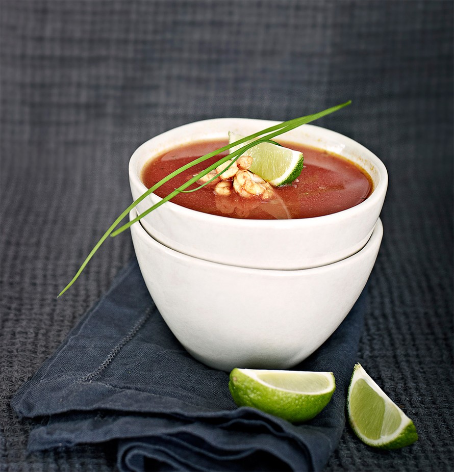 Helppo keitto valmistuu tomaattimehusta ja maustetuista katkaravuista.