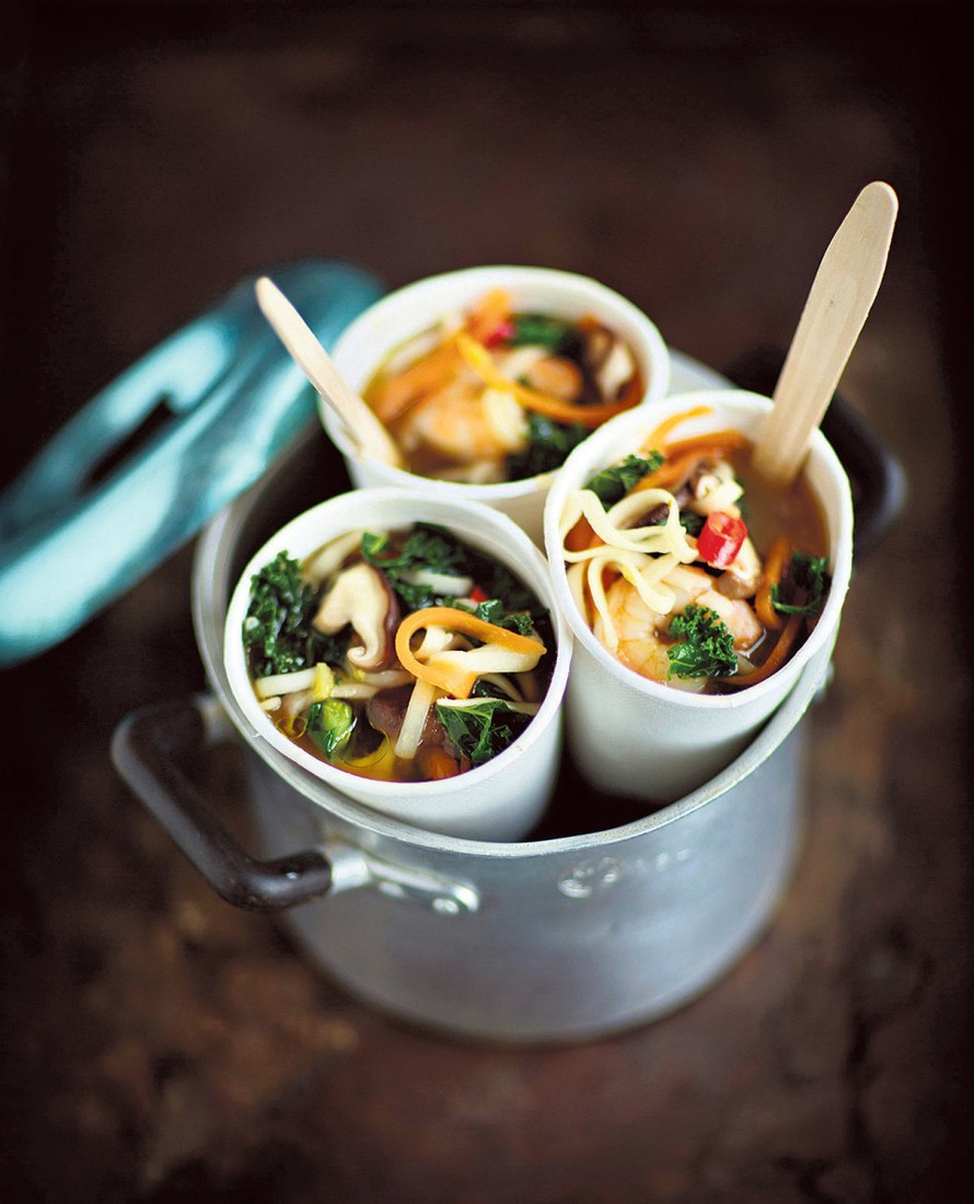 - Lisää lehtikaali, sienet ja tiikeriravunpyrstöt. Mausta soijalla ja mirinillä. Keitä pari minuuttia. Maista ja mausta tarvittaessa vielä suolalla. Lisää nuudelit ja keitä, kunnes ne ovat kypsiä. Lisää seesaminsiemenöljy.