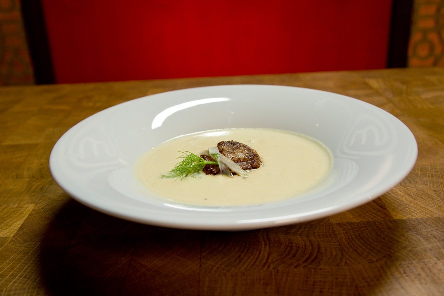 Fenkolikeittoa, fenkolisalaattia ja kampasimpukoita