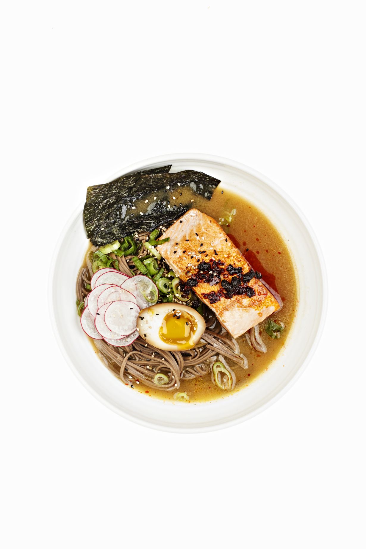 Astetta parempi arkiruoka pyöräytetään misolla maustetusta kasvisliemestä, paistetusta lohesta ja soijamarinoiduista munista.