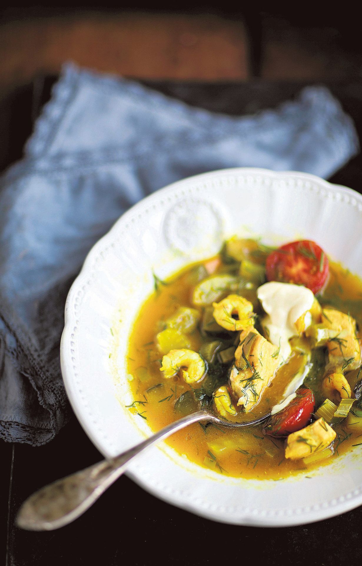 - Kuutioi lohifilee nahattomiksi paloiksi. Huuhtele ja halkaise kirsikkatomaatit. Lisää keiton joukkoon lohipalat, tomaatit ja katkaravut. Ripottele päälle hienonnettua lehtipersiljaa tai tilliä. Nosta kattila levyltä, peitä kannella ja anna hautua 5 minuuttia.