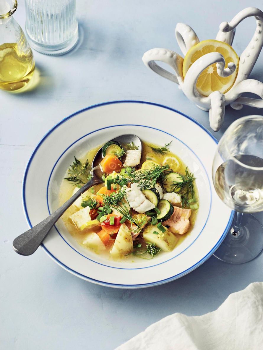 Kalakeittoon lisätty valkosipuli, sitruuna, oliiviöljya tuovat keittoon kesäisen raikasta makua. Kreikkalaiseen tapaan lisätty tomaatti tekee maulle myös ihmeitä.