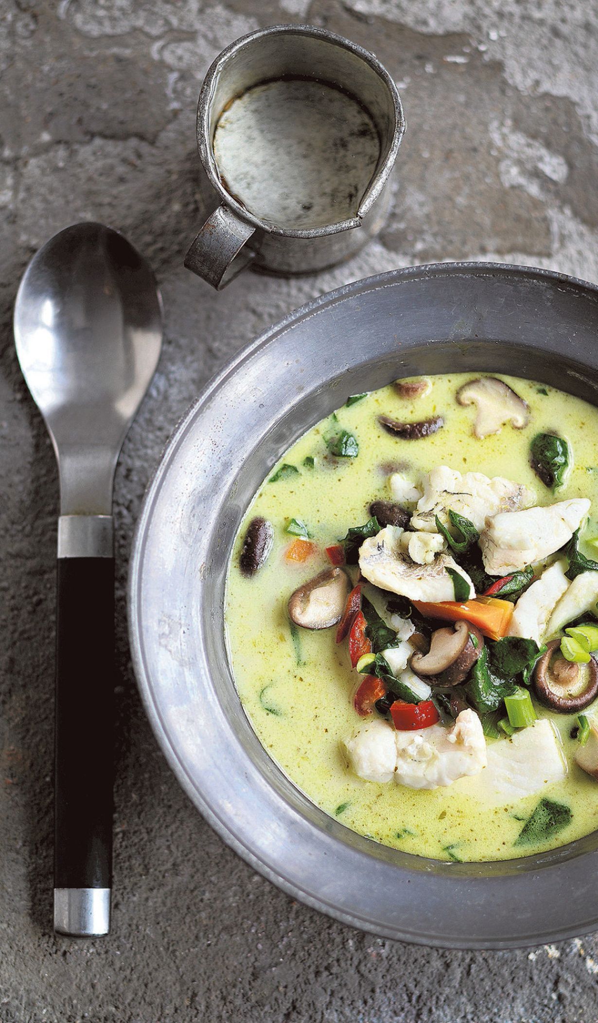 - Lisää joukkoon huuhdotut pinaatinlehdet ja kuhafileekuutiot. Mausta ruokosokerilla ja kalakastikkeella. Kiehauta ja keitä vielä pari minuuttia.