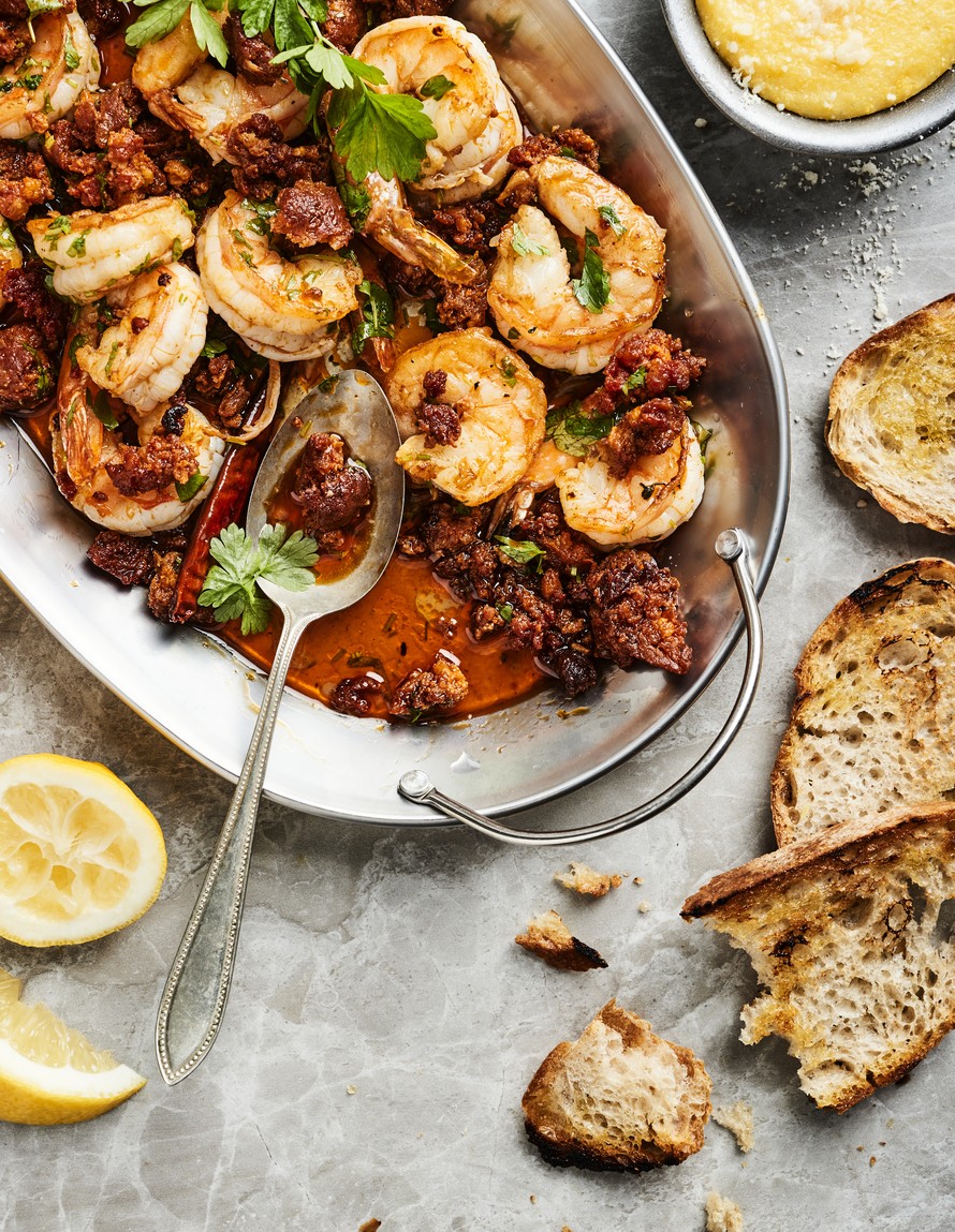Chorizo ja jättiravut ovat tuttu yhdistelmä espanajalaisista tapaksista. Hetkessä valmistuva naposteluateria sisältää runsaasti makua ja parmesaanipolentan kanssa kunnon aterian.