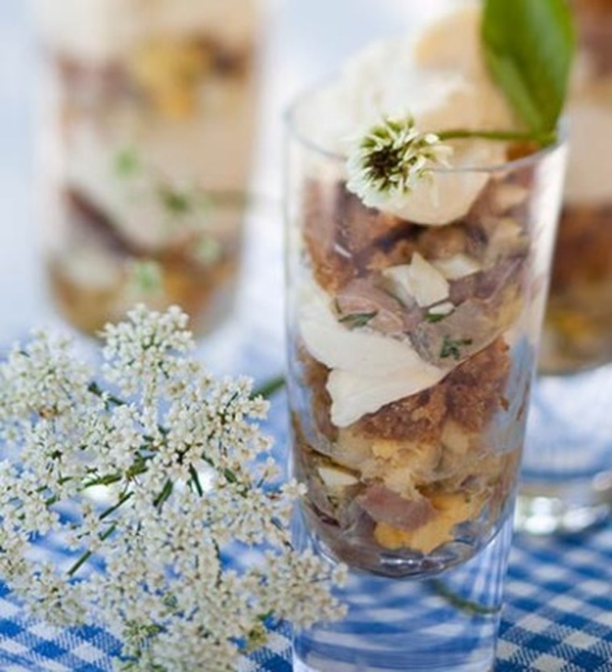 - Kokoa laseihin kerroksittain silliseosta, leipämuruja ja smetanaa. Laita päällimmäiseksi kerros smetanaa. Koristele punasipulilla ja ruohosipulilla.