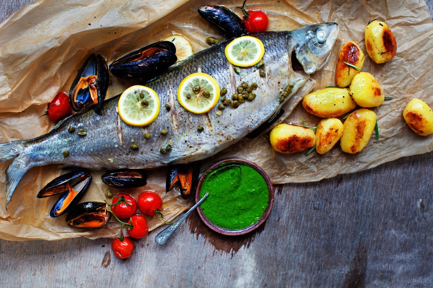 Näyttävä mutta helppo kalaruoka valmistuu kevyesti höyryn avulla. Ihanat rosmariiniperunat ja raikas salsa verde viimeistelevät makunautinnon.