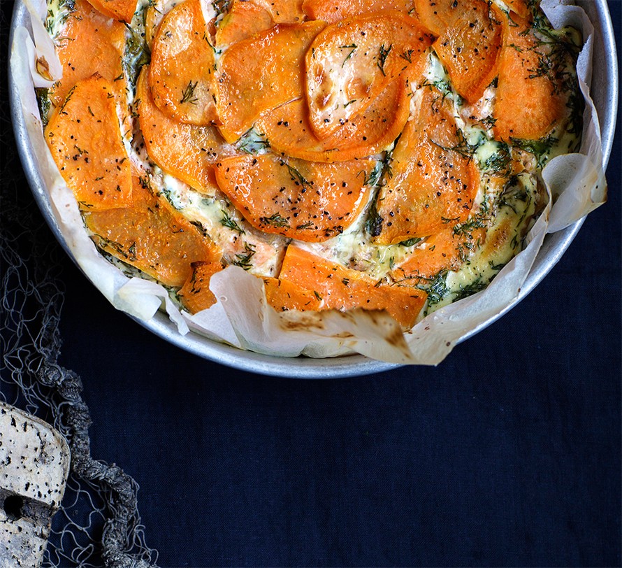 - Levitä bataatin päälle sipulia ja sipulin päälle lohiviipaleita, parmesaania ja basilikaa tai pinaattia. Täytä vuoka näin.