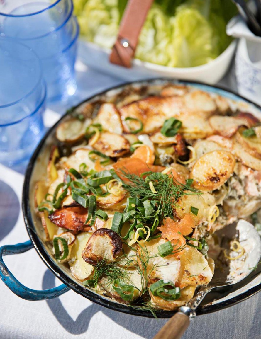 - Voitele uunivuoka (2 l) voilla. Lado vuokaan kerroksittain perunoita, kylmäsavulohiviipaleita ja yrtti-sitruunaseosta. Rouhi pippuria kerrosten väliin. Jätä suurin osa suolasta pinnalle, sillä kylmäsavu- lohi on suolaista.