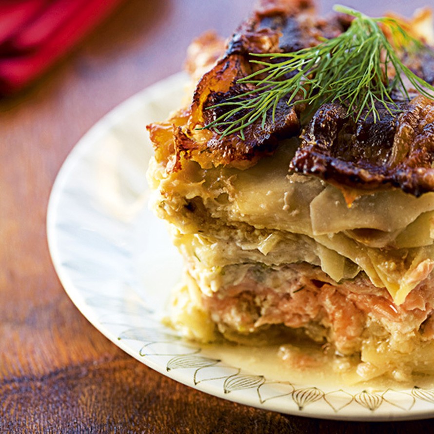 - Lado perunaviipaleet, sipuli, kalat, tilli ja mausteet kerroksittain voideltuun uunivuokaan. Vatkaa munat ja maito yhteen. Kaada seos vuokaan. Nosta siankylkiviipaleet pinnalle.