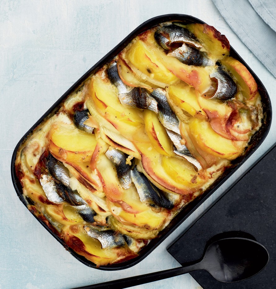 Herkkua silakoista! Tässä kermaisessa laatikossa silakat saavat seuraukseen perunoita ja savujuustoa.